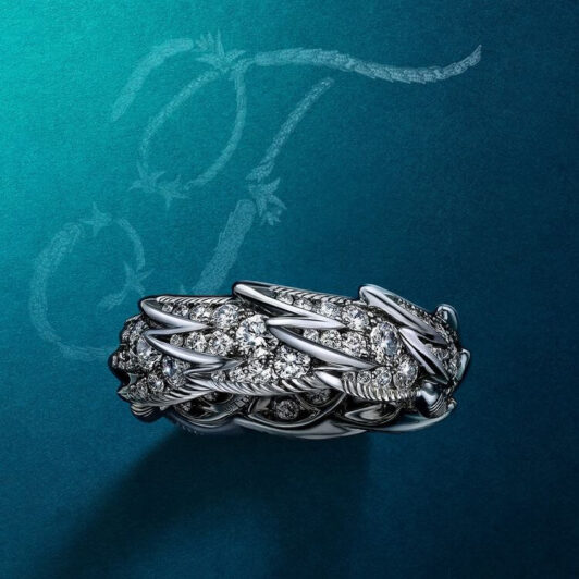 La colección Bird on a Rock reinterpreta el icónico broche de Jean Schlumberger con conjuntos de alta joyería y una nueva línea de joyería fina. La colección de joyería fina presenta dos aspectos diferentes: uno figurativo y otro abstracto. Las aves figurativas, elaboradas en platino y oro de 18 quilates con vibrantes piedras preciosas, parecen revolotear delicadamente y posarse sobre quien las lleva.